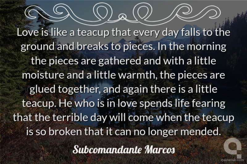 Love is like a teacup that every day falls to the ground and breaks to pieces. In the morning the pieces are gathered and with a little moisture and a little warmth, the pieces are glued together, and again there is a little teacup. He who is in love spends life fearing that the terrible day will come when the teacup is so broken that it can no longer mended.