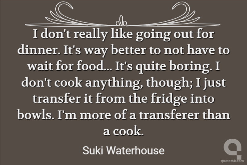 I don't really like going out for dinner. It's way better to not have to wait for food... It's quite boring. I don't cook anything, though; I just transfer it from the fridge into bowls. I'm more of a transferer than a cook.