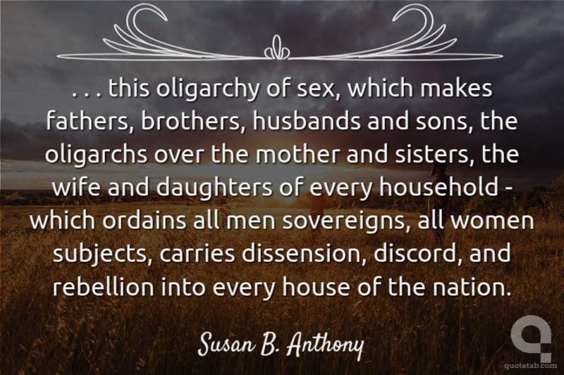 . . . this oligarchy of sex, which makes fathers, brothers, husbands and sons, the oligarchs over the mother and sisters, the wife and daughters of every household - which ordains all men sovereigns, all women subjects, carries dissension, discord, and rebellion into every house of the nation.