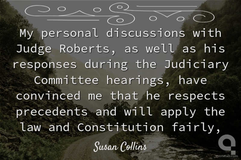 My personal discussions with Judge Roberts, as well as his responses during the Judiciary Committee hearings, have convinced me that he respects precedents and will apply the law and Constitution fairly,