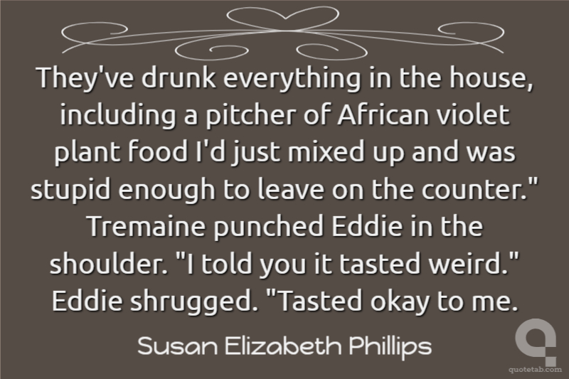 They've drunk everything in the house, including a pitcher of African violet plant food I'd just mixed up and was stupid enough to leave on the counter." Tremaine punched Eddie in the shoulder. "I told you it tasted weird." Eddie shrugged. "Tasted okay to me.