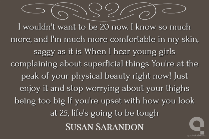 I wouldn't want to be 20 now. I know so much more, and I'm much more comfortable in my skin, saggy as it is When I hear young girls complaining about superficial things You're at the peak of your physical beauty right now! Just enjoy it and stop worrying about your thighs being too big If you're upset with how you look at 25, life's going to be tough