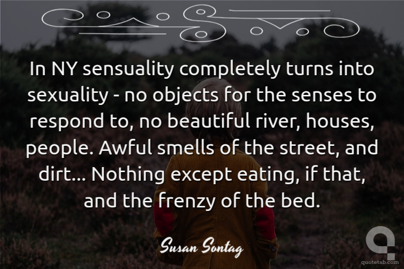 In NY sensuality completely turns into sexuality - no objects for the senses to respond to, no beautiful river, houses, people. Awful smells of the street, and dirt... Nothing except eating, if that, and the frenzy of the bed.