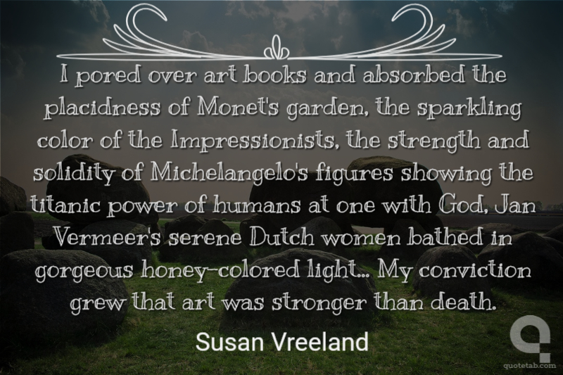 I pored over art books and absorbed the placidness of Monet's garden, the sparkling color of the Impressionists, the strength and solidity of Michelangelo's figures showing the titanic power of humans at one with God, Jan Vermeer's serene Dutch women bathed in gorgeous honey-colored light... My conviction grew that art was stronger than death.