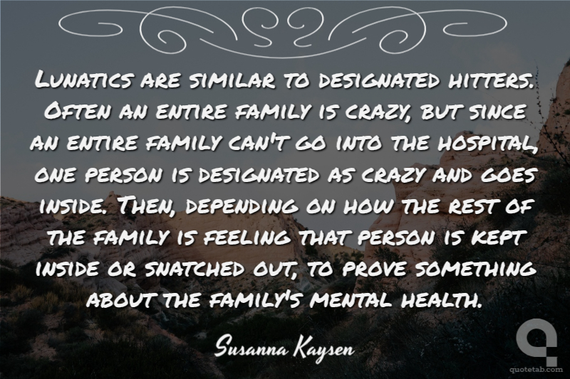 Lunatics are similar to designated hitters. Often an entire family is crazy, but since an entire family can't go into the hospital, one person is designated as crazy and goes inside. Then, depending on how the rest of the family is feeling that person is kept inside or snatched out, to prove something about the family's mental health.