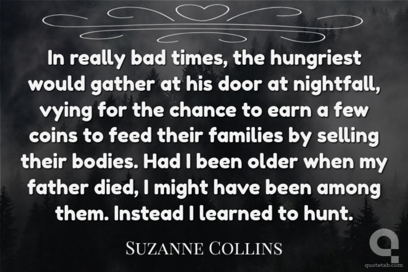 She must have really loved him to leave her home for the Seam. I try to remember that when all I can see is the woman who sat by, blank and unreachable, while her children turned to skin and bones. I try to forgive her for my father's sake. But to be honest, I'm not the forgiving type.