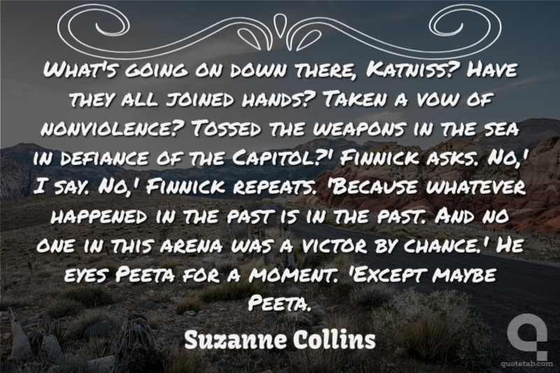 What's going on down there, Katniss? Have they all joined hands? Taken a vow of nonviolence? Tossed the weapons in the sea in defiance of the Capitol?' Finnick asks. No,' I say. No,' Finnick repeats. 'Because whatever happened in the past is in the past. And no one in this arena was a victor by chance.' He eyes Peeta for a moment. 'Except maybe Peeta.