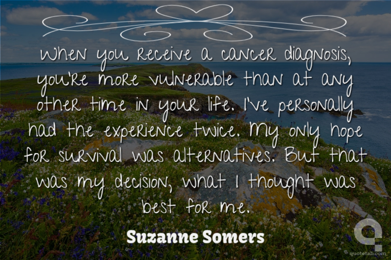 When you receive a cancer diagnosis, you're more vulnerable than at any other time in your life. I've personally had the experience twice. My only hope for survival was alternatives. But that was my decision, what I thought was best for me.