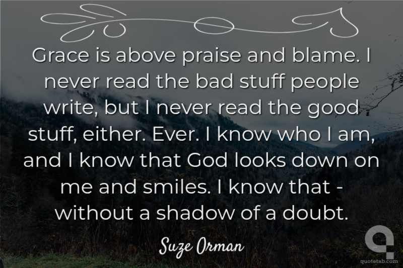 Grace is above praise and blame. I never read the bad stuff people write, but I never read the good stuff, either. Ever. I know who I am, and I know that God looks down on me and smiles. I know that - without a shadow of a doubt.