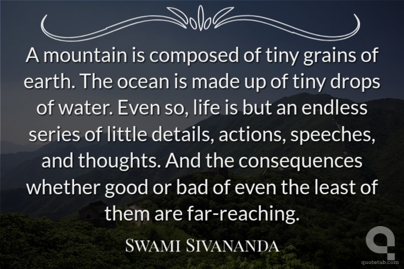 A mountain is composed of tiny grains of earth. The ocean is made up of tiny drops of water. Even so, life is but an endless series of little details, actions, speeches, and thoughts. And the consequences whether good or bad of even the least of them are far-reaching.