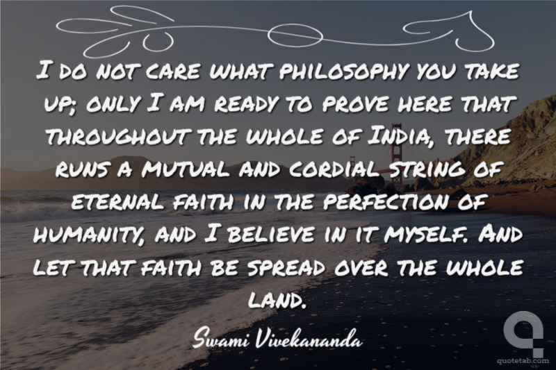 I do not care what philosophy you take up; only I am ready to prove here that throughout the whole of India, there runs a mutual and cordial string of eternal faith in the perfection of humanity, and I believe in it myself. And let that faith be spread over the whole land.