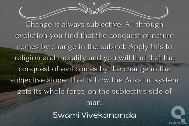 Change is always subjective. All through evolution you find that the conquest of nature comes by change in the subject. Apply this to religion and morality, and you will find that the conquest of evil comes by the change in the subjective alone. That is how the Advaitic system gets its whole force, on the subjective side of man.