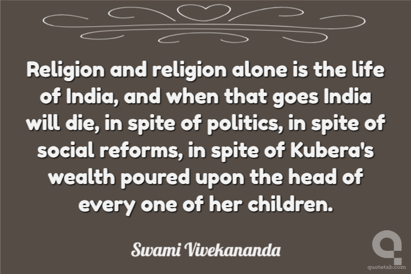 Religion and religion alone is the life of India, and when that goes India will die, in spite of politics, in spite of social reforms, in spite of Kubera's wealth poured upon the head of every one of her children.