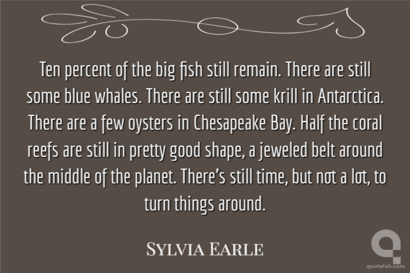 Ten percent of the big fish still remain. There are still some blue whales. There are still some krill in Antarctica. There are a few oysters in Chesapeake Bay. Half the coral reefs are still in pretty good shape, a jeweled belt around the middle of the planet. There's still time, but not a lot, to turn things around.