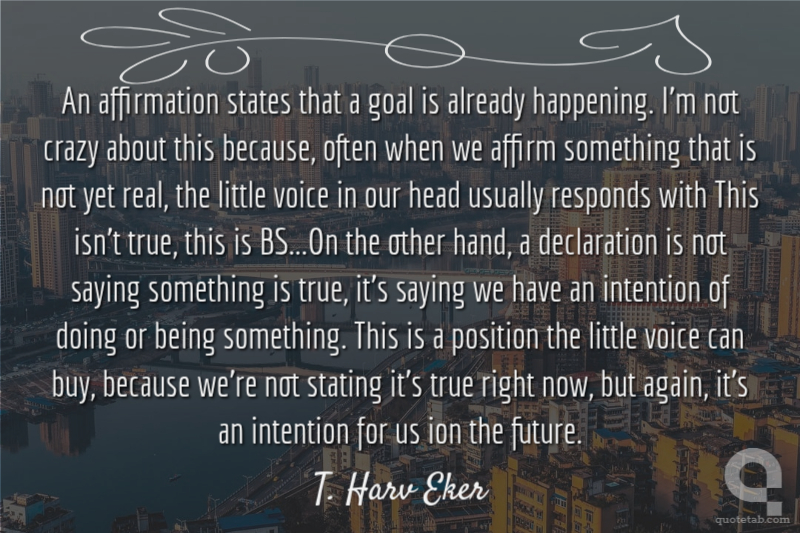 An affirmation states that a goal is already happening. I'm not crazy about this because, often when we affirm something that is not yet real, the little voice in our head usually responds with This isn't true, this is BS...On the other hand, a declaration is not saying something is true, it's saying we have an intention of doing or being something. This is a position the little voice can buy, because we're not stating it's true right now, but again, it's an intention for us ion the future.