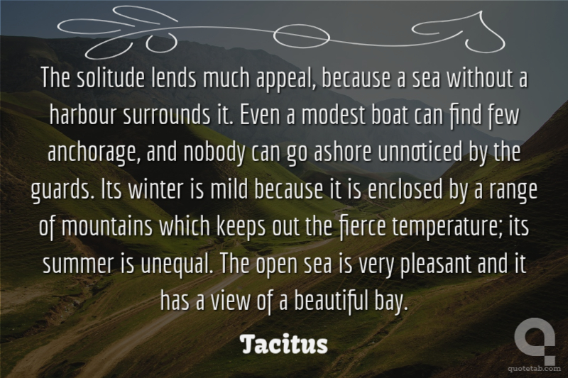 The solitude lends much appeal, because a sea without a harbour surrounds it. Even a modest boat can find few anchorage, and nobody can go ashore unnoticed by the guards. Its winter is mild because it is enclosed by a range of mountains which keeps out the fierce temperature; its summer is unequal. The open sea is very pleasant and it has a view of a beautiful bay.