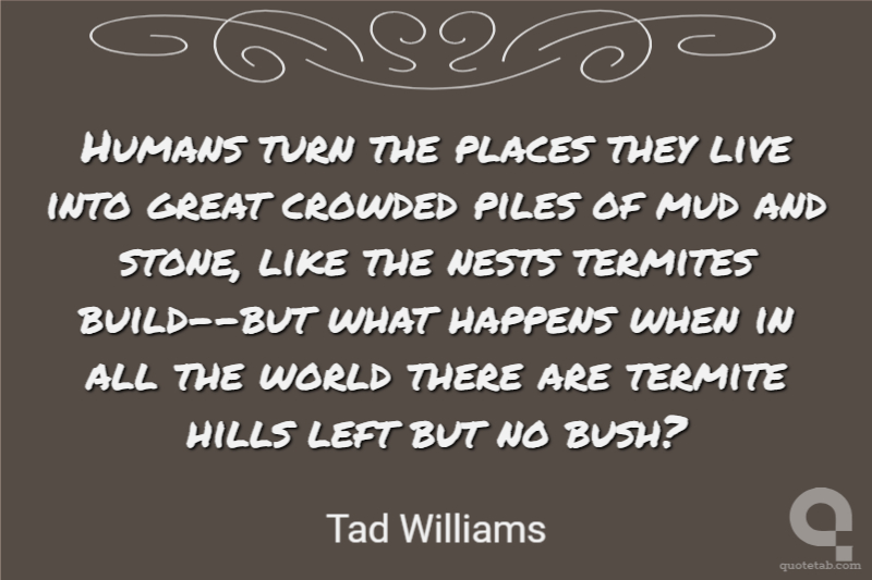 Humans turn the places they live into great crowded piles of mud and stone, like the nests termites build--but what happens when in all the world there are termite hills left but no bush?