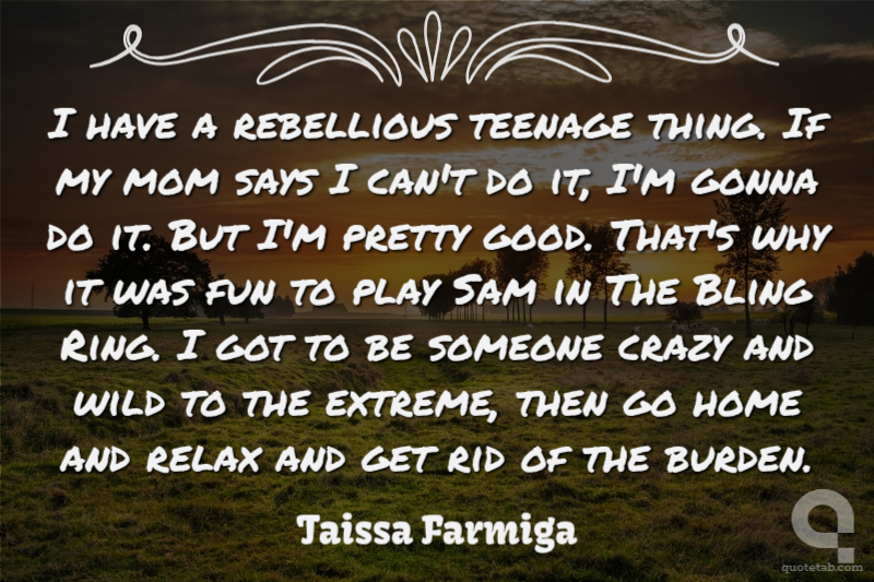 I have a rebellious teenage thing. If my mom says I can't do it, I'm gonna do it. But I'm pretty good. That's why it was fun to play Sam in The Bling Ring. I got to be someone crazy and wild to the extreme, then go home and relax and get rid of the burden.
