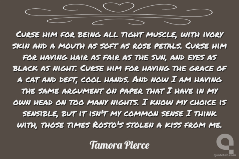 Curse him for being all tight muscle, with ivory skin and a mouth as soft as rose petals. Curse him for having hair as fair as the sun, and eyes as black as night. Curse him for having the grace of a cat and deft, cool hands. And now I am having the same argument on paper that I have in my own head on too many nights. I know my choice is sensible, but it isn't my common sense I think with, those times Rosto's stolen a kiss from me.