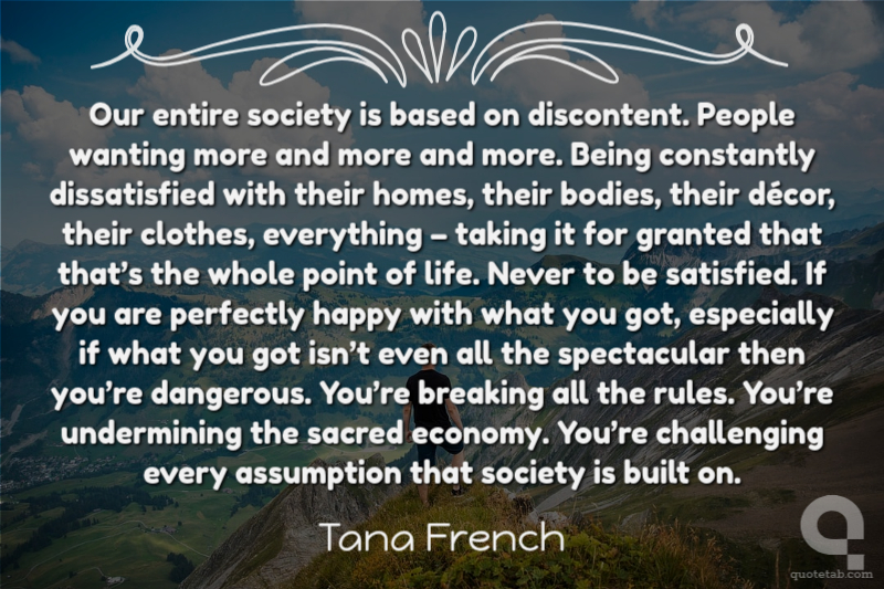 Our entire society is based on discontent. People wanting more and more and more. Being constantly dissatisfied with their homes, their bodies, their décor, their clothes, everything – taking it for granted that that’s the whole point of life. Never to be satisfied. If you are perfectly happy with what you got, especially if what you got isn’t even all the spectacular then you’re dangerous. You’re breaking all the rules. You’re undermining the sacred economy. You’re challenging every assumption that society is built on.