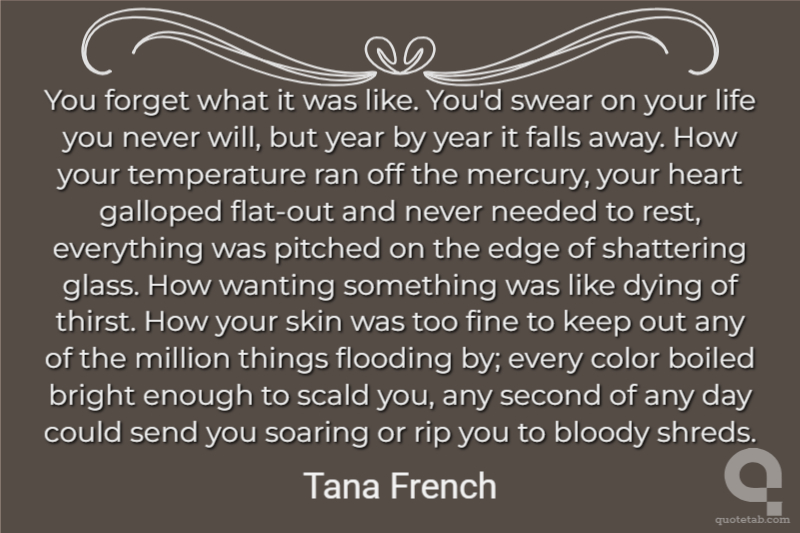 You forget what it was like. You'd swear on your life you never will, but year by year it falls away. How your temperature ran off the mercury, your heart galloped flat-out and never needed to rest, everything was pitched on the edge of shattering glass. How wanting something was like dying of thirst. How your skin was too fine to keep out any of the million things flooding by; every color boiled bright enough to scald you, any second of any day could send you soaring or rip you to bloody shreds.