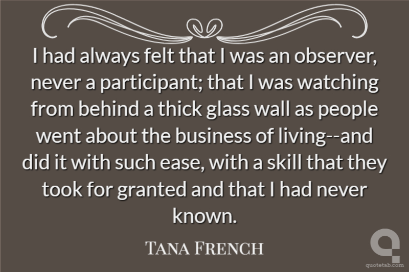 I had always felt that I was an observer, never a participant; that I was watching from behind a thick glass wall as people went about the business of living--and did it with such ease, with a skill that they took for granted and that I had never known.