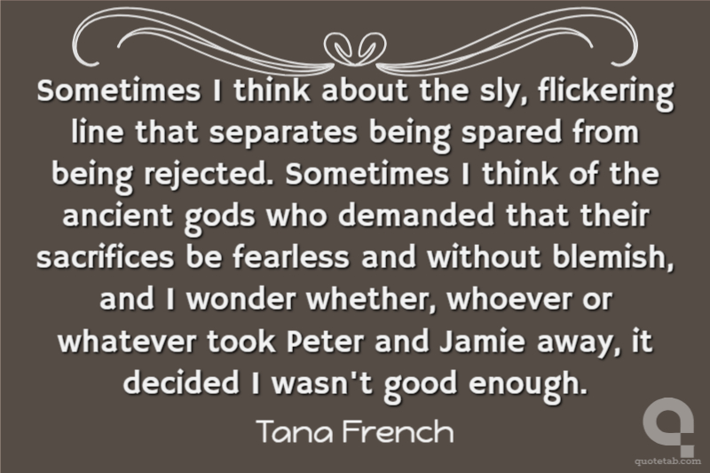 Sometimes I think about the sly, flickering line that separates being spared from being rejected. Sometimes I think of the ancient gods who demanded that their sacrifices be fearless and without blemish, and I wonder whether, whoever or whatever took Peter and Jamie away, it decided I wasn't good enough.