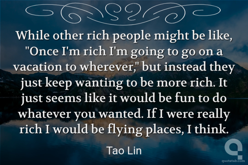 While other rich people might be like, "Once I'm rich I'm going to go on a vacation to wherever," but instead they just keep wanting to be more rich. It just seems like it would be fun to do whatever you wanted. If I were really rich I would be flying places, I think.