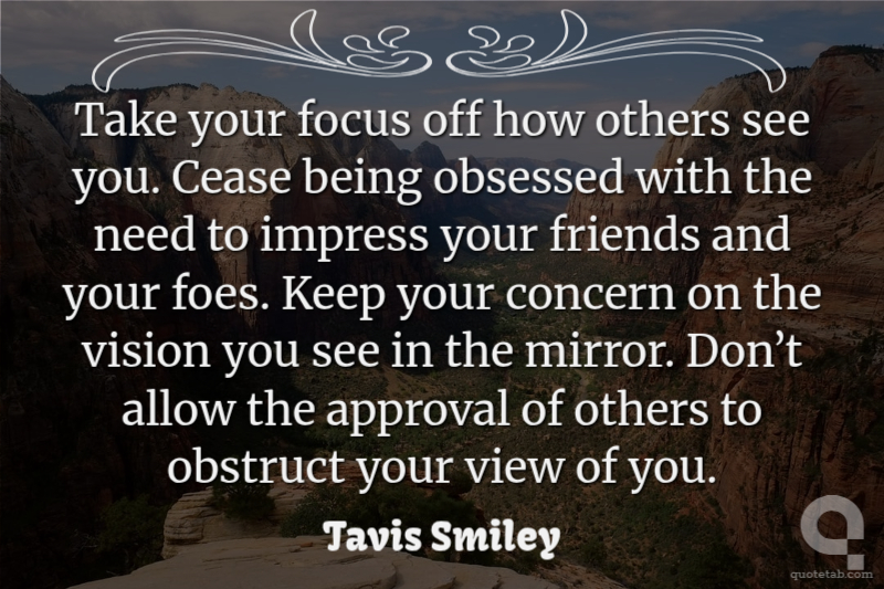 Take your focus off how others see you. Cease being obsessed with the need to impress your friends and your foes. Keep your concern on the vision you see in the mirror. Don’t allow the approval of others to obstruct your view of you.