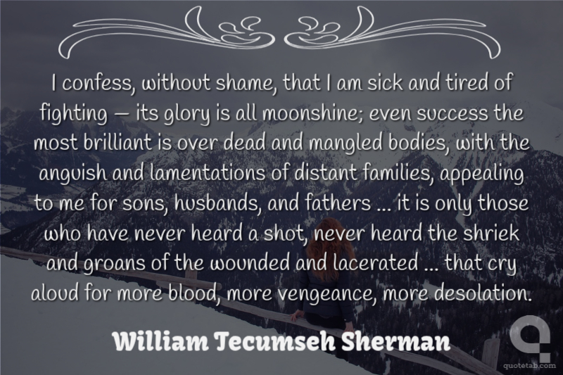 I confess, without shame, that I am sick and tired of fighting — its glory is all moonshine; even success the most brilliant is over dead and mangled bodies, with the anguish and lamentations of distant families, appealing to me for sons, husbands, and fathers ... it is only those who have never heard a shot, never heard the shriek and groans of the wounded and lacerated ... that cry aloud for more blood, more vengeance, more desolation.