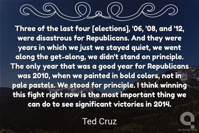 Three of the last four [elections], '06, '08, and '12, were disastrous for Republicans. And they were years in which we just we stayed quiet, we went along the get-along, we didn't stand on principle. The only year that was a good year for Republicans was 2010, when we painted in bold colors, not in pale pastels. We stood for principle. I think winning this fight right now is the most important thing we can do to see significant victories in 2014.