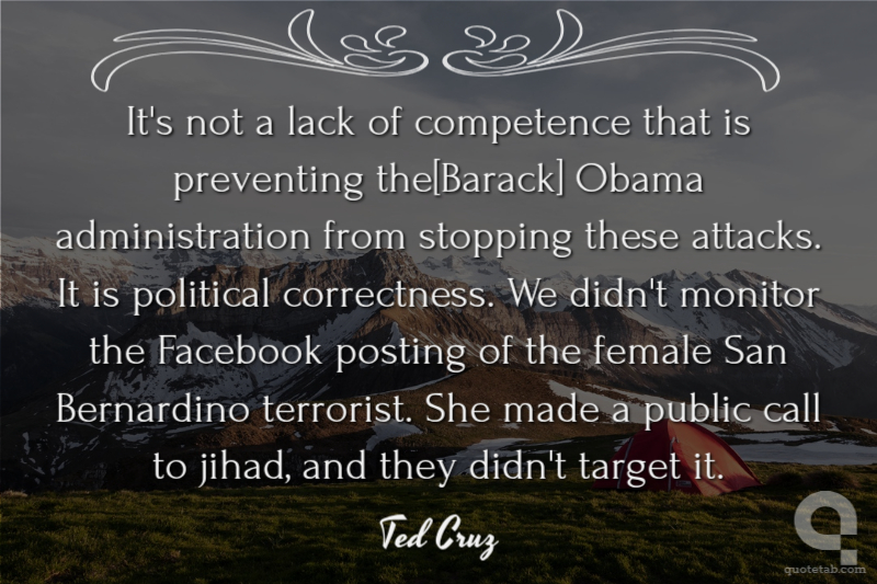 It's not a lack of competence that is preventing the[Barack] Obama administration from stopping these attacks. It is political correctness. We didn't monitor the Facebook posting of the female San Bernardino terrorist. She made a public call to jihad, and they didn't target it.
