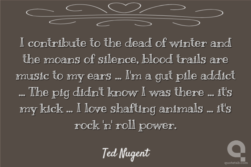 I contribute to the dead of winter and the moans of silence, blood trails are music to my ears ... I'm a gut pile addict ... The pig didn't know I was there ... it's my kick ... I love shafting animals ... it's rock 'n' roll power.