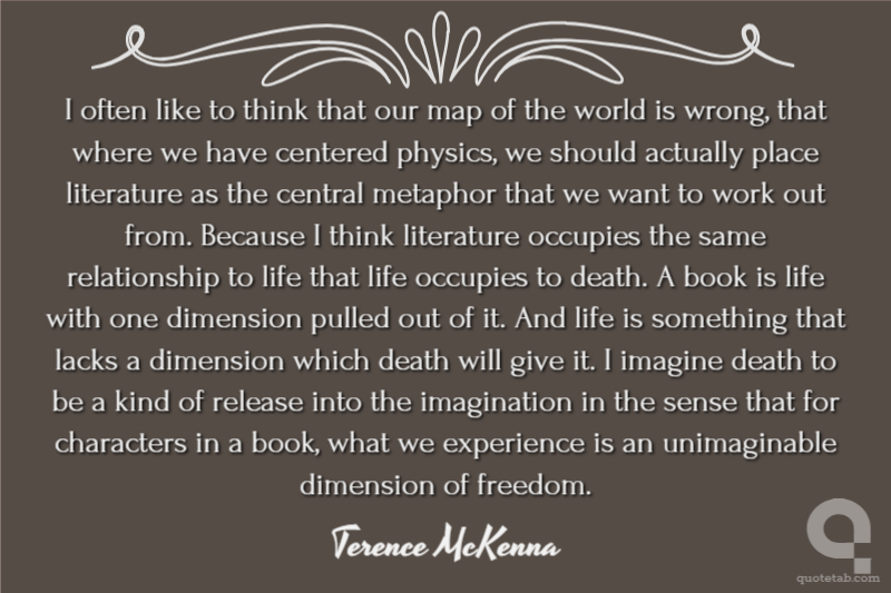 I often like to think that our map of the world is wrong, that where we have centered physics, we should actually place literature as the central metaphor that we want to work out from. Because I think literature occupies the same relationship to life that life occupies to death. A book is life with one dimension pulled out of it. And life is something that lacks a dimension which death will give it. I imagine death to be a kind of release into the imagination in the sense that for characters in a book, what we experience is an unimaginable dimension of freedom.