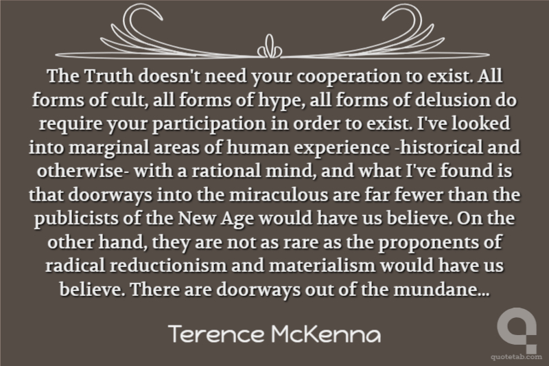 The Truth doesn't need your cooperation to exist. All forms of cult, all forms of hype, all forms of delusion do require your participation in order to exist. I've looked into marginal areas of human experience -historical and otherwise- with a rational mind, and what I've found is that doorways into the miraculous are far fewer than the publicists of the New Age would have us believe. On the other hand, they are not as rare as the proponents of radical reductionism and materialism would have us believe. There are doorways out of the mundane...