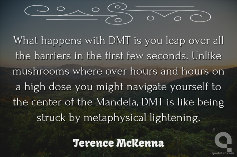 What happens with DMT is you leap over all the barriers in the first few seconds. Unlike mushrooms where over hours and hours on a high dose you might navigate yourself to the center of the Mandela, DMT is like being struck by metaphysical lightening.