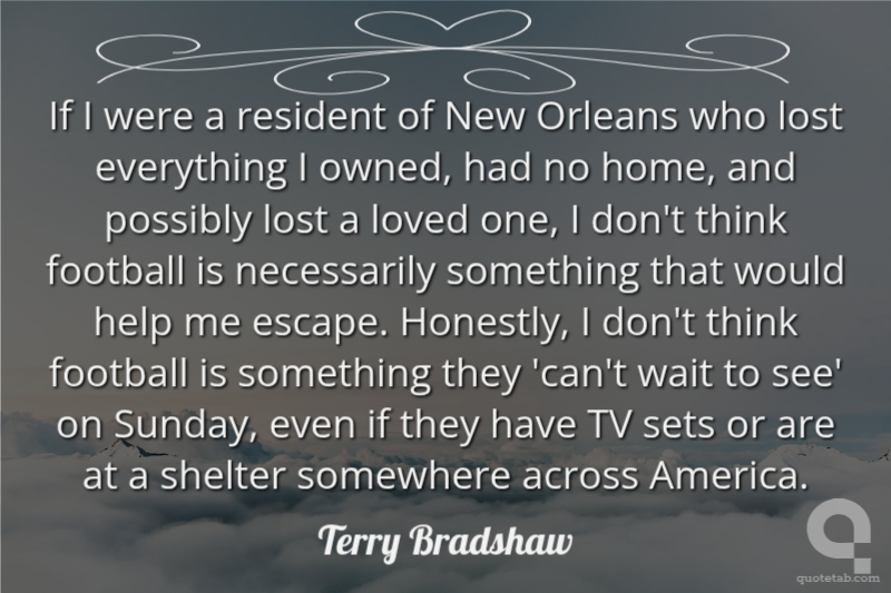 If I were a resident of New Orleans and had lost everything that I have, had no home, and possibly had lost a loved one, I really don't think that football is going to help me escape the present position that my family is in, ... I don't really think for those who have been most affected that the NFL is something they're going to be glad to see. ... For those who didn't lose everything, maybe it's a little different.