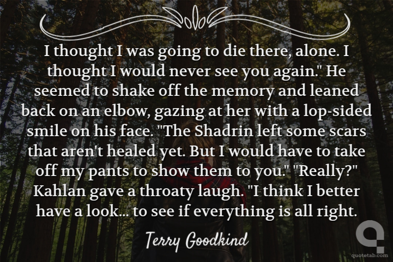 I thought I was going to die there, alone. I thought I would never see you again." He seemed to shake off the memory and leaned back on an elbow, gazing at her with a lop-sided smile on his face. "The Shadrin left some scars that aren't healed yet. But I would have to take off my pants to show them to you." "Really?" Kahlan gave a throaty laugh. "I think I better have a look... to see if everything is all right.
