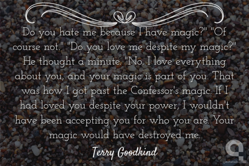 Do you hate me because I have magic?" "Of course not." "Do you love me despite my magic?" He thought a minute. "No. I love everything about you, and your magic is part of you. That was how I got past the Confessor's magic. If I had loved you despite your power, I wouldn't have been accepting you for who you are. Your magic would have destroyed me.