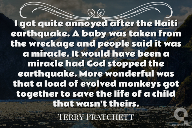 I got quite annoyed after the Haiti earthquake. A baby was taken from the wreckage and people said it was a miracle. It would have been a miracle had God stopped the earthquake. More wonderful was that a load of evolved monkeys got together to save the life of a child that wasn't theirs.