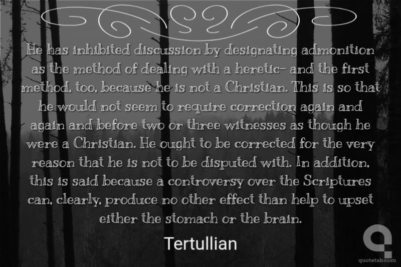 He has inhibited discussion by designating admonition as the method of dealing with a heretic- and the first method, too, because he is not a Christian. This is so that he would not seem to require correction again and again and before two or three witnesses as though he were a Christian. He ought to be corrected for the very reason that he is not to be disputed with. In addition, this is said because a controversy over the Scriptures can, clearly, produce no other effect than help to upset either the stomach or the brain.