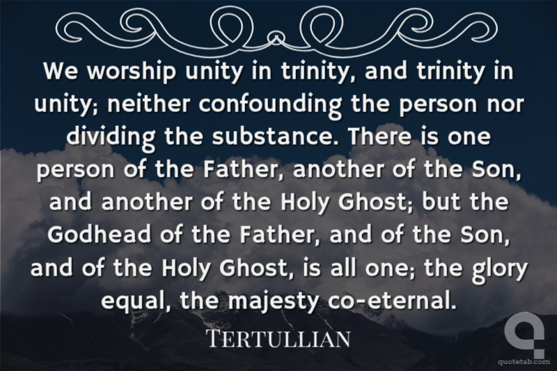 We worship unity in trinity, and trinity in unity; neither confounding the person nor dividing the substance. There is one person of the Father, another of the Son, and another of the Holy Ghost; but the Godhead of the Father, and of the Son, and of the Holy Ghost, is all one; the glory equal, the majesty co-eternal.