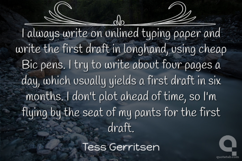 I always write on unlined typing paper and write the first draft in longhand, using cheap Bic pens. I try to write about four pages a day, which usually yields a first draft in six months. I don't plot ahead of time, so I'm flying by the seat of my pants for the first draft.