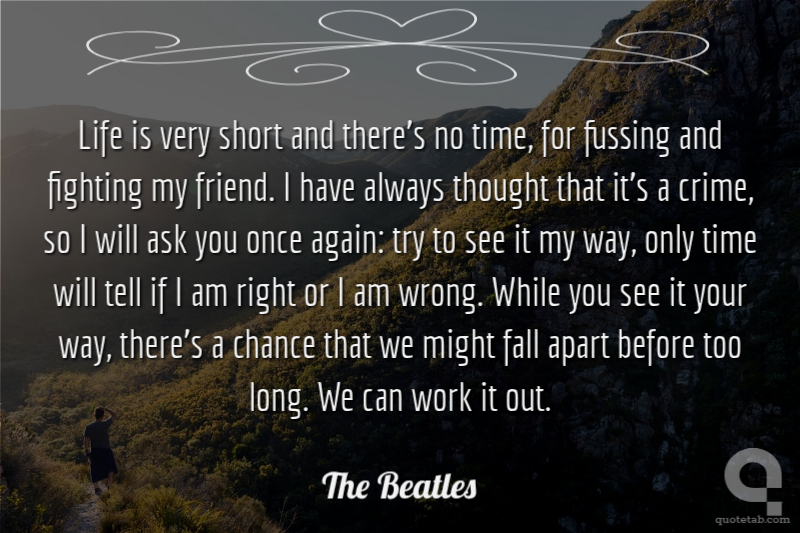 Life is very short and there's no time, for fussing and fighting my friend. I have always thought that it's a crime, so I will ask you once again: try to see it my way, only time will tell if I am right or I am wrong. While you see it your way, there's a chance that we might fall apart before too long. We can work it out.