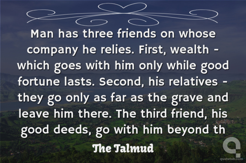 Man has three friends on whose company he relies. First, wealth - which goes with him only while good fortune lasts. Second, his relatives - they go only as far as the grave and leave him there. The third friend, his good deeds, go with him beyond th