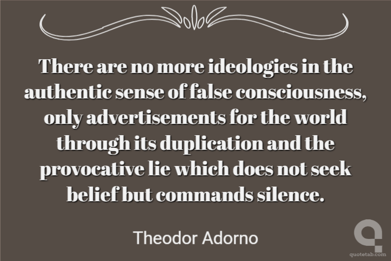 There are no more ideologies in the authentic sense of false consciousness, only advertisements for the world through its duplication and the provocative lie which does not seek belief but commands silence.