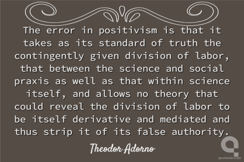 The error in positivism is that it takes as its standard of truth the contingently given division of labor, that between the science and social praxis as well as that within science itself, and allows no theory that could reveal the division of labor to be itself derivative and mediated and thus strip it of its false authority.