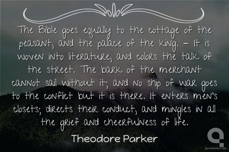 The Bible goes equally to the cottage of the peasant, and the palace of the king. - It is woven into literature, and colors the talk of the street. The bark of the merchant cannot sail without it; and no ship of war goes to the conflict but it is there. It enters men's closets; directs their conduct, and mingles in all the grief and cheerfulness of life.