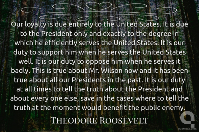 Our loyalty is due entirely to the United States. It is due to the President only and exactly to the degree in which he efficiently serves the United States. It is our duty to support him when he serves the United States well. It is our duty to oppose him when he serves it badly. This is true about Mr. Wilson now and it has been true about all our Presidents in the past. It is our duty at all times to tell the truth about the President and about every one else, save in the cases where to tell the truth at the moment would benefit the public enemy.