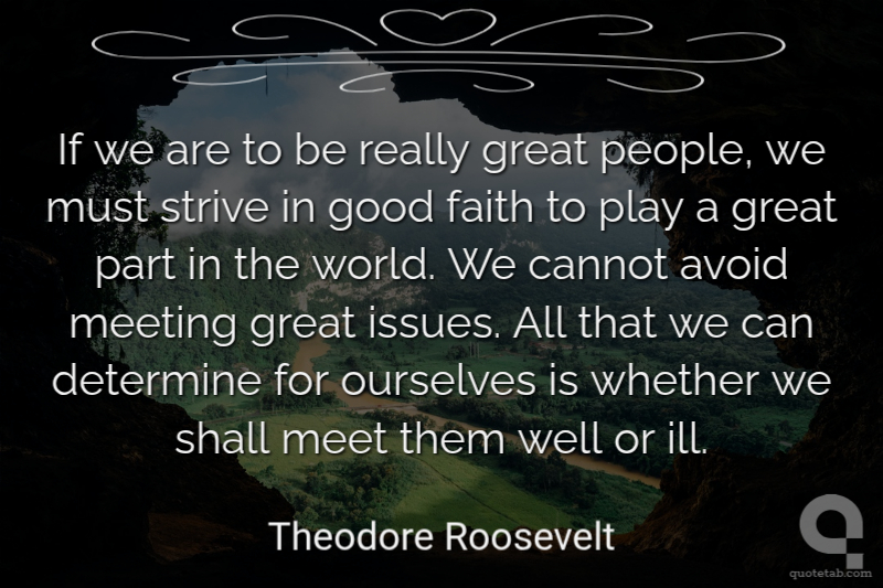 If we are to be really great people, we must strive in good faith to play a great part in the world. We cannot avoid meeting great issues. All that we can determine for ourselves is whether we shall meet them well or ill.